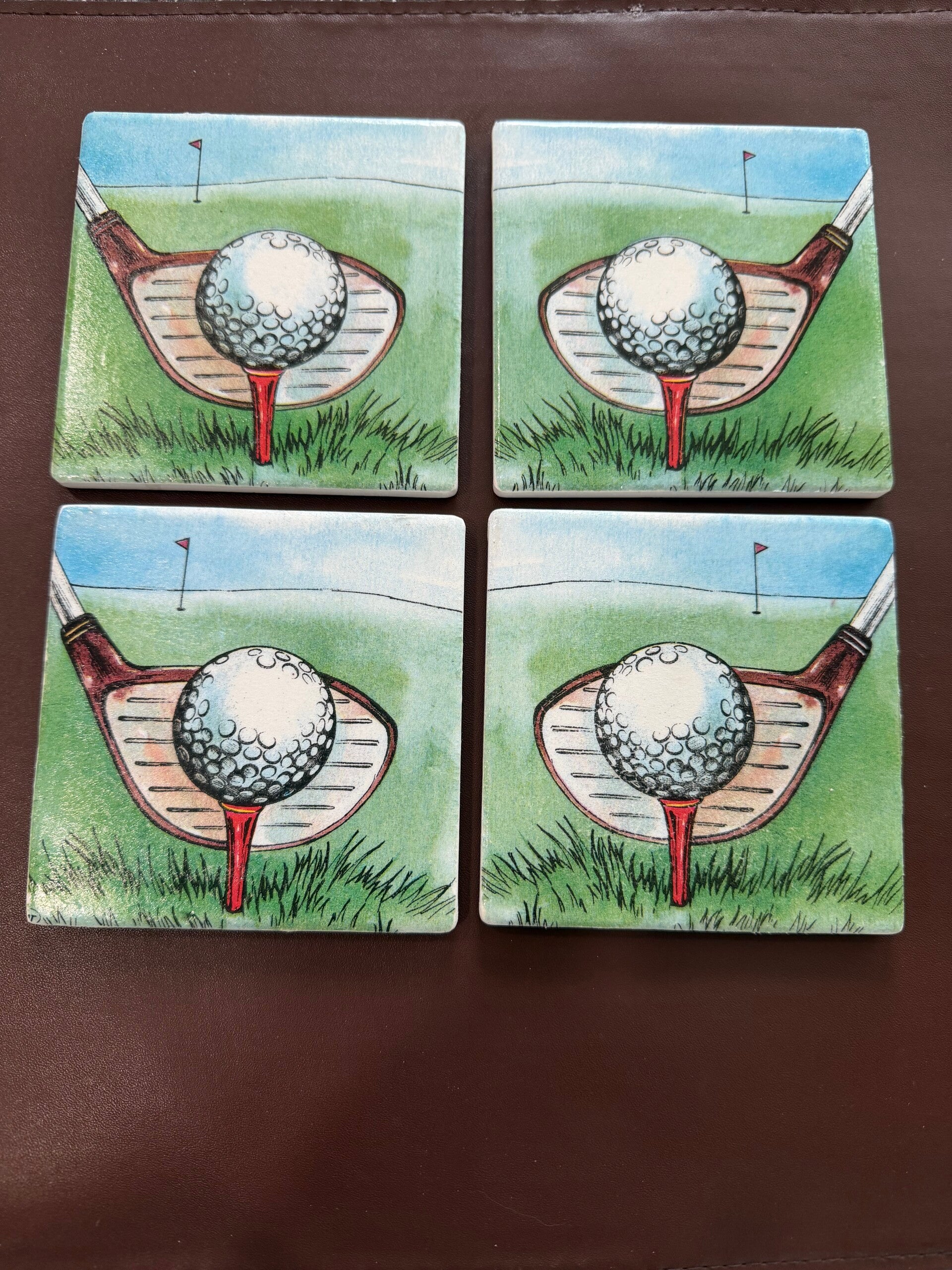 These coasters come in a set of 4. They are tile coasters with a cork back. Perfect for the golf fanatic in your life!