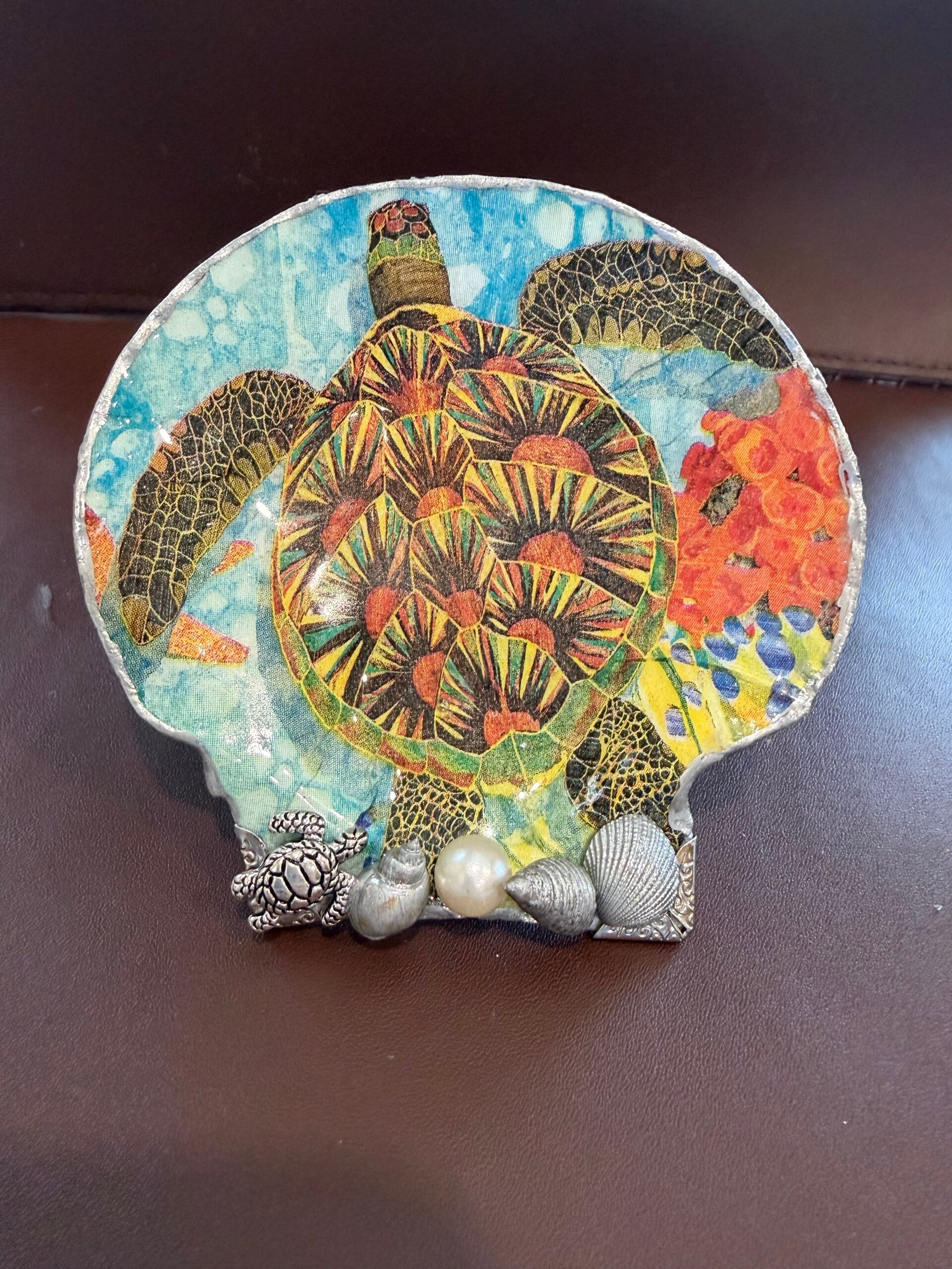 This piece has an adorable turtle design. Framed in silver and embellished with silver corners, silver shells and a pearl. The back of the shell is metallic silver and the stand is silver. it measures 4x4x2 inches.